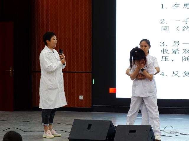 活动主要分为理论宣讲、实操指导两部分。主讲人谷席娟以通俗易懂的话语讲解胸外按压、人工呼吸和海姆立克急救法的理论知识,将急救知识的要点用轻松幽默的语言表达出来,并通过“石头、剪刀、布”等朗朗上口的小口诀加强师生们对理论知识的记忆。宣讲过程中,主讲人不时与台下师生互动,并对他们提出的问题进行详细解答。宣讲部分结束后,志愿者利用心肺复苏模拟人进行操作示范,对如何判断心跳呼吸骤停、如何进行胸外按压和人工呼吸等操作进行现场演示,并邀请师生进行实操练习。志愿者耐心纠正老师和同学们操作过程中出现的错误,并给予细心指导,帮助他们掌握正确有效的急救方法。