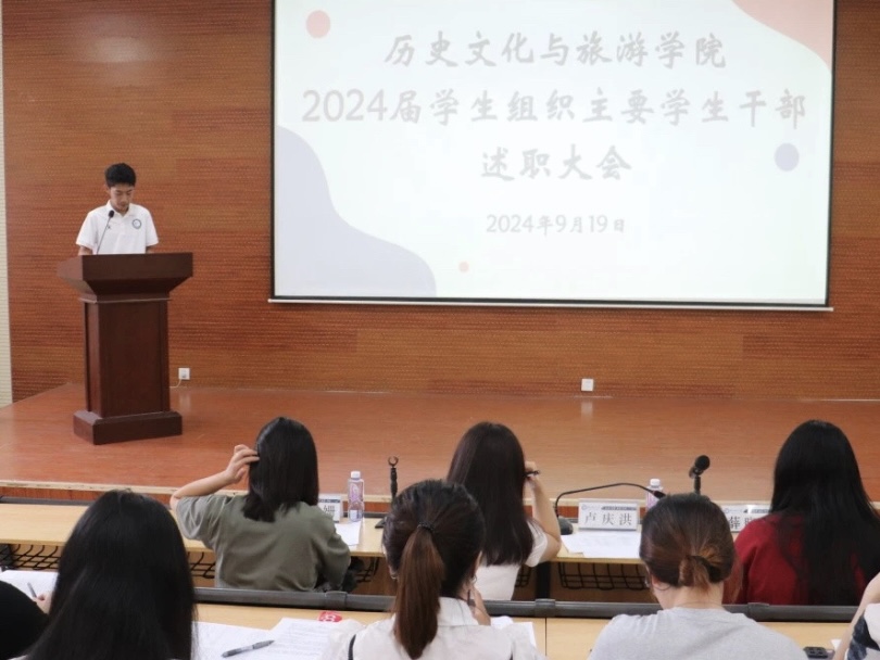 为加强学院团委学生会内部建设,切实提升学生骨干的任职履职能力,促进高素质学生干部队伍的建设,9月19日,历史文化与旅游学院于6#A104、6#A106召开2024届学生组织主要学生干部述职大会暨2025届学生组织主要学生干部选举大会。学院党委副书记卢庆洪,团委书记石晓晗,辅导员薛晓宇、尤姗姗出席会议,部分学生组织成员参加会议。