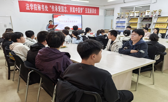 为激发学生的爱国热情,传承和弘扬爱国主义精神,10月24日,法学院于西校区10#A510举办以“传承爱国志,共筑中国梦”为主题的交流座谈会,辅导员孟冠军出席此次活动,法学院2023级、2024级部分学生参加此次活动。