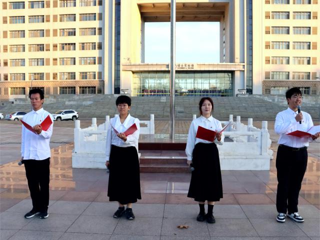 晨光熹微,同学们整齐排列成方阵,等待升旗仪式开始。七点整,活动拉开序幕,主持人赵子源和李沚璇宣布升旗仪式正式开始。国旗护卫队迎着东方的晨曦,迈着整齐的步伐,昂首阔步向前。庄严的国歌奏响,旗手扬起五星红旗,全体师生心怀崇敬,注视着那抹鲜艳的红色冉冉升起。学生代表张继翀进行国旗下演讲《怀历史之殇,铸民族辉煌》,号召同学们感悟思想伟力,砥砺奋进征程,在新时代的起点勇担民族复兴的历史重任。辅导员徐一凡讲述主题微团课,引领同学们回望中华民族波澜壮阔的崛起之路,聆听历史的哀音,鼓励同学们紧握历史的接力棒,以先辈为榜样,在中国共产党的领导下,弘扬爱国主义精神,汲取奋进力量。赵佳慧等四名同学朗诵《在时光的长河》,气势磅礴,感情饱满,讲述过往的艰难曲折,列举当今的辉煌成就,激励同学们立鸿鹄之志、树奋发之心,积极投身于社会主义建设之中。