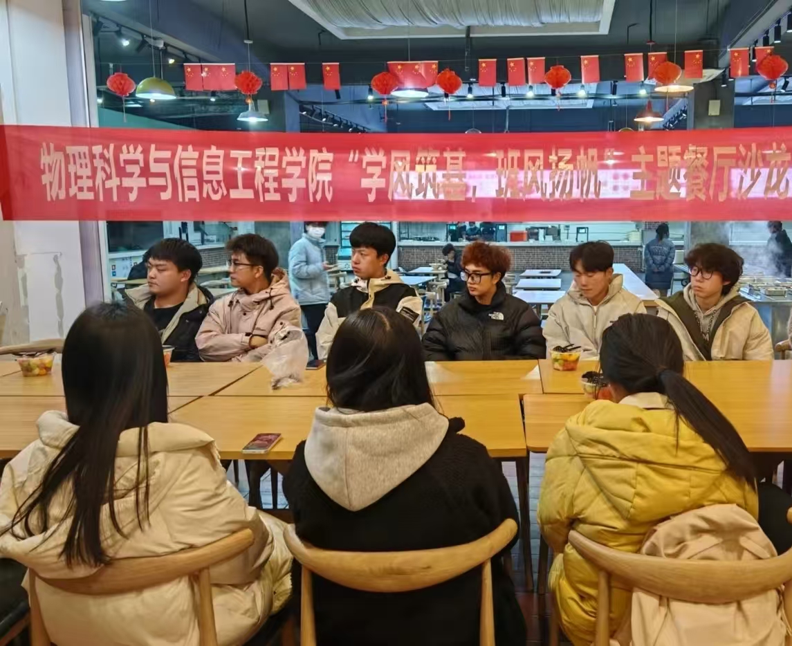 为强化班风与学风建设,促进班级凝聚力,推动校园文化建设和学生全面发展,12月3日,物理科学与信息工程学院于湖苑餐厅三楼举办“学风筑基,班风扬帆”餐厅沙龙活动,本次活动由团委书记洪文静、辅导员王平、徐光建以及2024级各班班长、团支书共同参与。