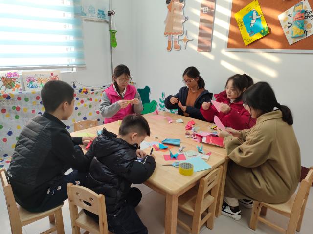 折纸艺术,源远流长,以一张张平凡的纸张,通过巧手折叠,幻化出千变万化的形态,既是童年时光里的欢乐记忆,也是传统文化传承的生动载体。每一道折痕,都承载着匠人的智慧与情感,将简单的纸张转化为富有生命力的艺术品。志愿者们依托折纸艺术展板,借助千纸鹤、纸飞机等作品,以生动有趣的方式向小朋友们介绍折纸的历史起源、发展演变以及其丰富多样的独特技法,带领小朋友们领略折纸世界的独特魅力。宣讲结束后,志愿者们带领小朋友们一起体验制作折纸作品。从基础的对角折叠到复杂的形态塑造,从常规的边缘对齐到精巧的立体穿插,小朋友们自主尝试、大胆创新,小手依循指导灵活摆弄彩纸。伴随着欢声笑语,一只只精巧的纸鹤、一朵朵绚烂的纸花依次成型,仿佛赋予了彩纸鲜活的生命力。活动最后,志愿者们对小朋友们的作品成果进行展示,表扬小朋友们作品中的闪光点,现场氛围和谐融洽。