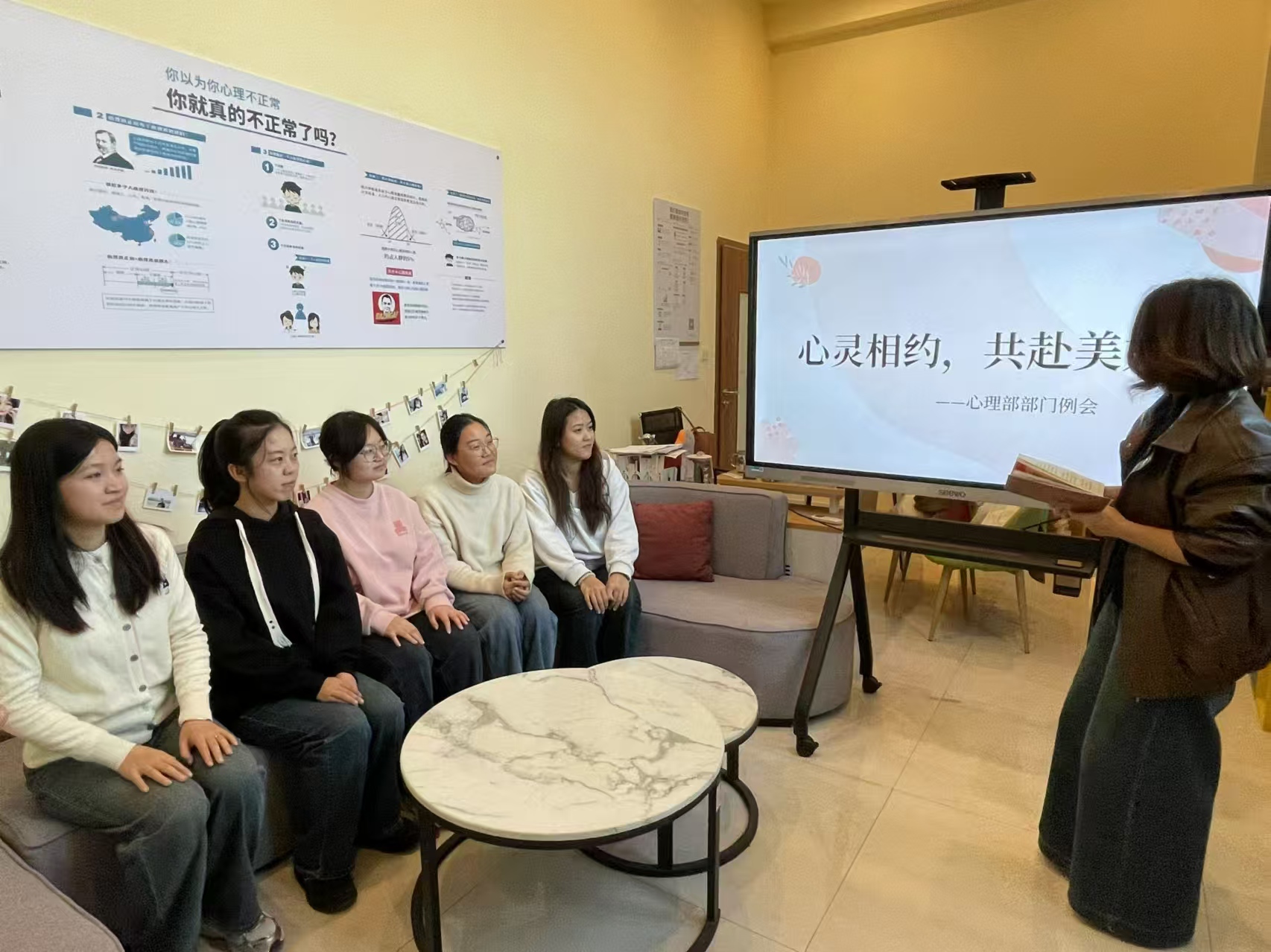 主讲人徐娜主要从如何开展心理约谈工作、心理危机排查工作的步骤以及约谈工作的注意事项这三个方面展开详细讲解。徐娜向成员们详细介绍心理工作开展的具体步骤和安排,包括开展工作的具体时间和流程等,同时对部门成员的不同职责和任务作出明确的安排,从而确保部门日常工作的正常开展。例会中,徐娜向部员们讲述约谈工作的技巧,用实例说明如何开展约谈工作。另外,徐娜指出应高度重视心理普测问题背后新生的心理需求问题,引导学生积极求助,做好心理指导。最后,徐娜强调要在部门工作中注重成员间的合作和协调,鼓励心理部成员们互相帮助,共同迎接困难与挑战,更好地推进部门工作的顺利进行。部门成员宋娅萌表示,通过此次例会,使她对自身的工作和职责有更加明确的认识,为今后的心理约谈工作指明目标和方向,从而更好地帮助同学们提升自身的心理健康水平。