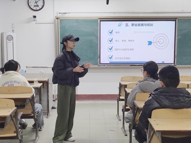 而在职业发展与规划部分,教师刘姸引导学生们思考如何在激烈的全球人才竞争中找准自己的定位,同时也强调了专业能力和专业素养的重要性,包括专业课程的深入学习、汉语作为第二语言教学实践能力以及跨文化交际能力的培养等。同时,老师鼓励同学们提高国际中文教育的专业认同感、增强专业自豪感和使命感。这不仅关乎个人的职业前景,更关乎国际中文教育事业的长远发展。