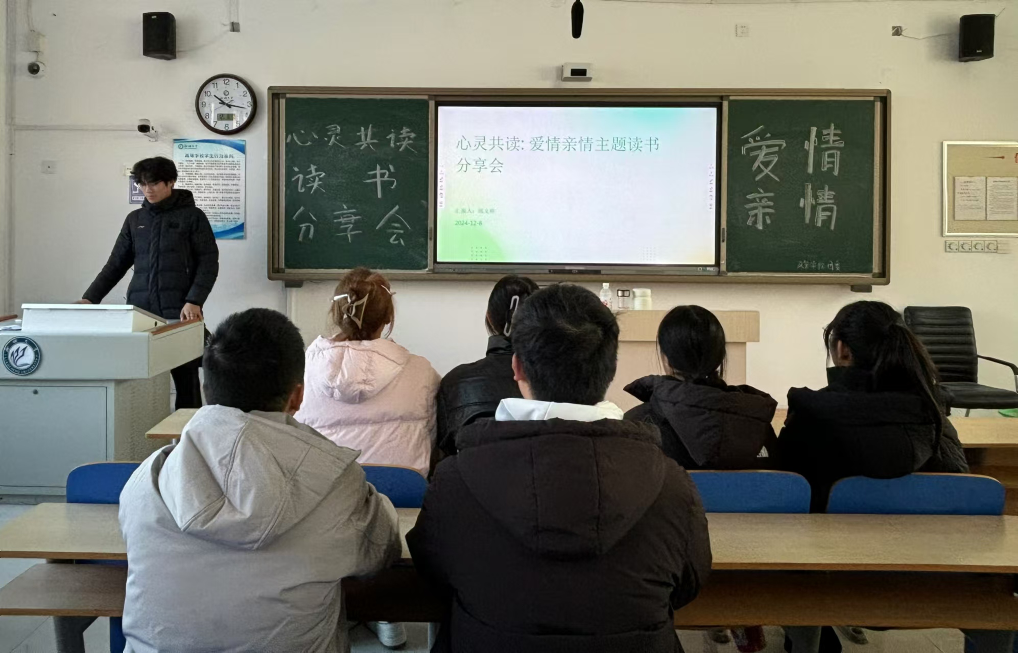 活动负责人邱文祥通过PPT的形式向参与者介绍本次活动。邱文祥通过播放《简爱》《平凡的世界》等多部文学作品的片段,吸引参与者展开深入的探讨。主讲人表示,这些文学作品以其深刻的情感描绘和细腻的人物刻画,让在场的参与者感受到心灵的触动。参与者们在此次读书分享会活动中不仅收获到知识与感悟,更感受到人与人之间的温暖。邱文祥通过生动的案例分析,揭示了爱情与亲情在个人成长与心理健康中的作用。主讲人引导参与者从社会结构和文化背景的角度,探讨两种情感在现代社会中的变迁和缩影。在互动环节,参与者积极发言,分享自己对于爱情和亲情的感悟。邱文祥作出总结,此次活动让参与者在忙碌的大学生活中找到片刻的宁静与慰藉,也让我们更加珍惜身边那些给予我们爱与支持的人。参与者孙文阳表示,通过此次活动,更加深刻地认识到了爱情与亲情对于人类生活的重要性,也更加珍惜与家人和伴侣之间的相处时光。