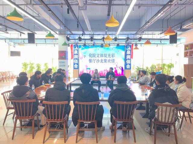 为进一步增强文体活动部的团队建设,提高成员之间的凝聚力,缓解大家学习、工作和生活方面的压力,12月18日,化学化工学院于翰苑餐厅二楼举办“化院文体绽光彩,餐厅沙龙聚欢情”餐厅沙龙活动。化学化工学院团委副书记孙忠月、辅导员贾云超以及文体活动部全体成员参加本次活动。
