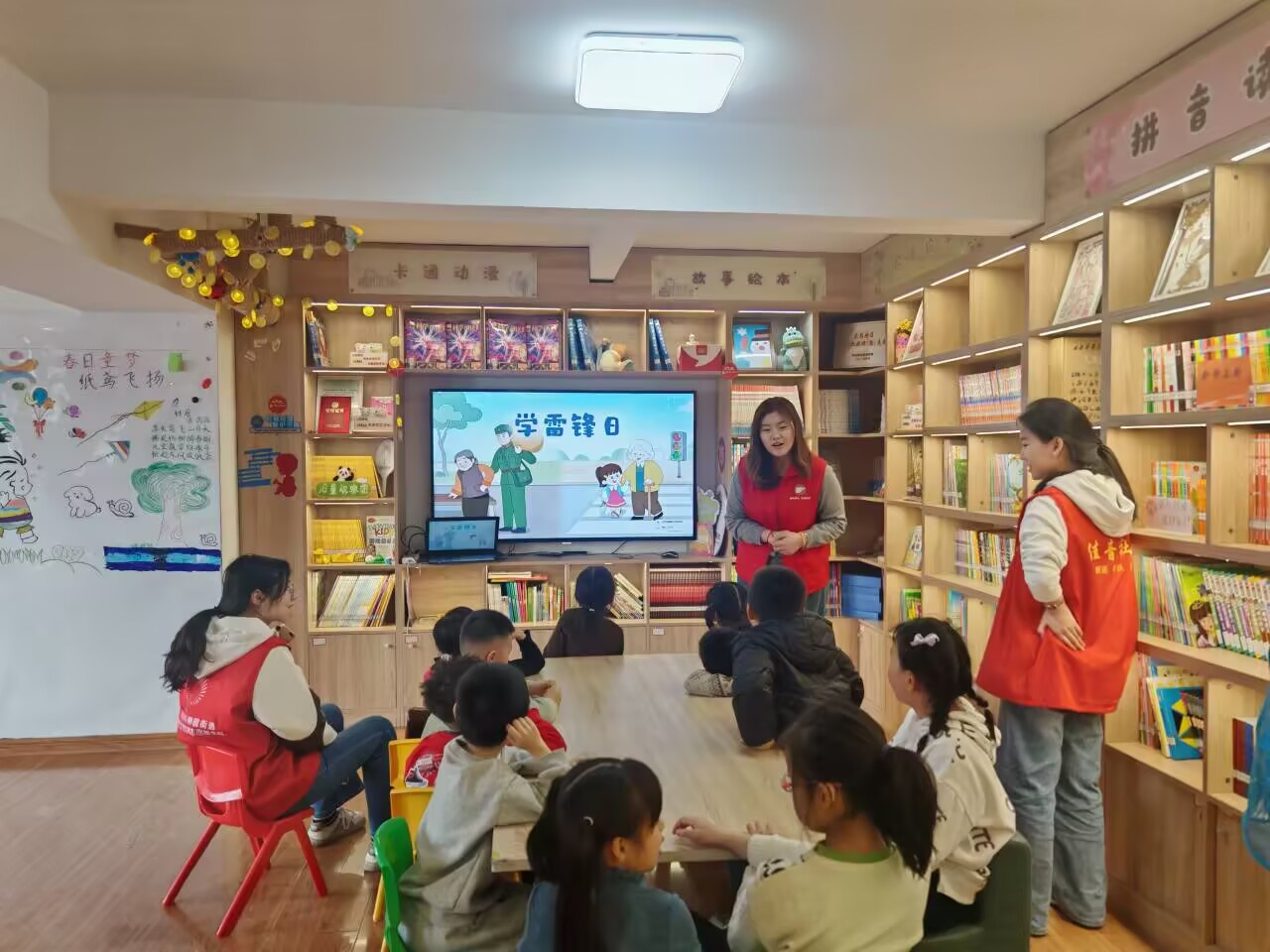 活动中,志愿者们分成小组,与孩子们围坐在一起。他们用生动有趣的语言讲述雷锋的故事,从雷锋小时候的艰苦生活说起,谈到他如何在平凡的岗位上做出不平凡的事迹,讲述雷锋同志如何用一生诠释“奉献”二字。为了让雷锋精神更加深入人心,志愿者们还组织了互动环节。他们播放了一段雷锋事迹的动画短片,片中雷锋冒雨送大娘的场景让许多孩子深受触动。最后志愿者组织儿童们分享交流想法。孩子们纷纷举手发言,有的说要像雷锋叔叔一样乐于助人,有的说要学习雷锋叔叔的奉献精神,现场气氛热烈而温馨。