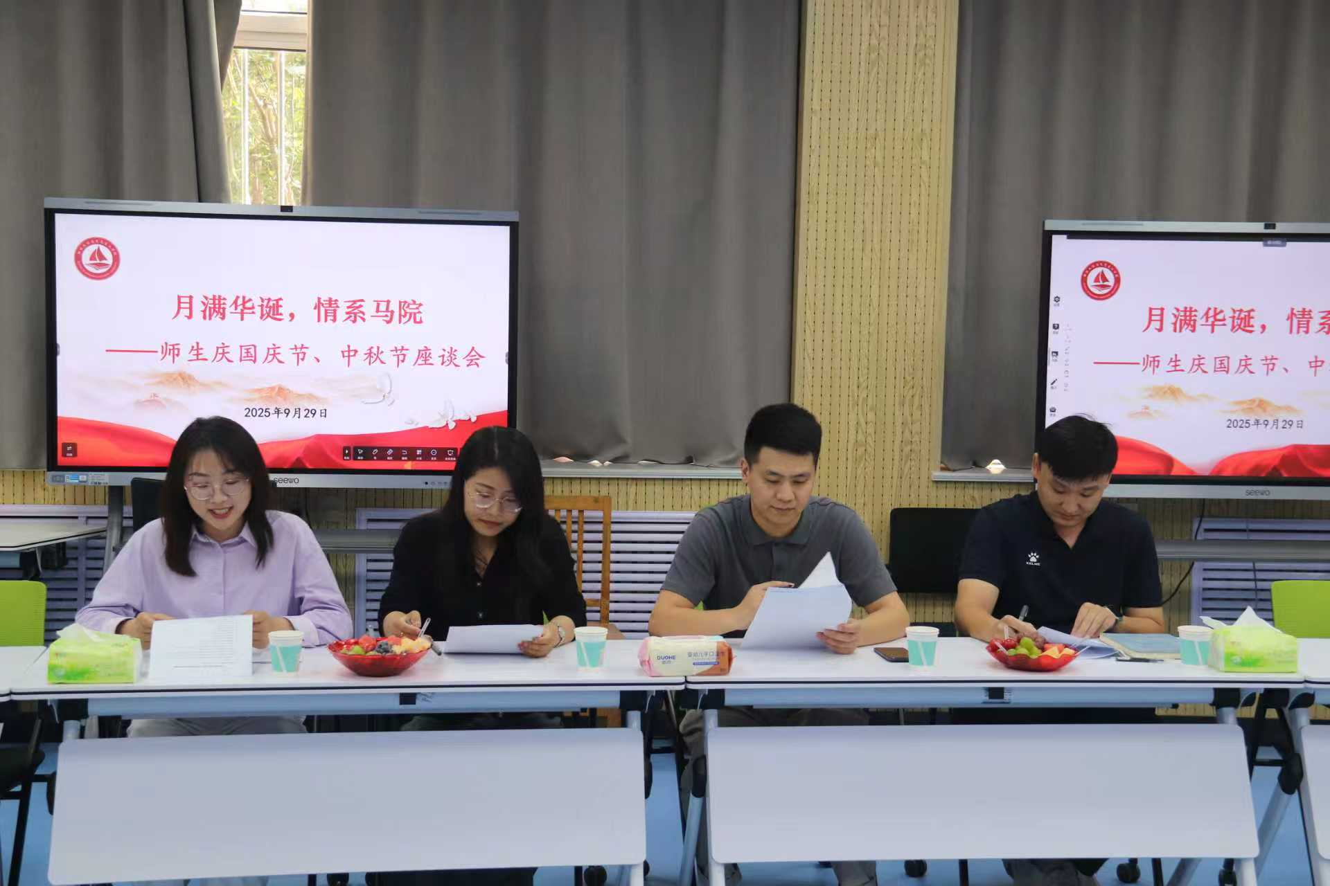 金秋送爽,丹桂飘香。在中秋与国庆双节交汇的美好时刻,9月29日,我院于东校区6#A101举办“月满华诞,情系马院”师生庆双节座谈会,学院团委书记史仁扩、辅导员裴新丽、新生班主任及学生代表齐聚一堂,共叙家国情怀,共话青春梦想。