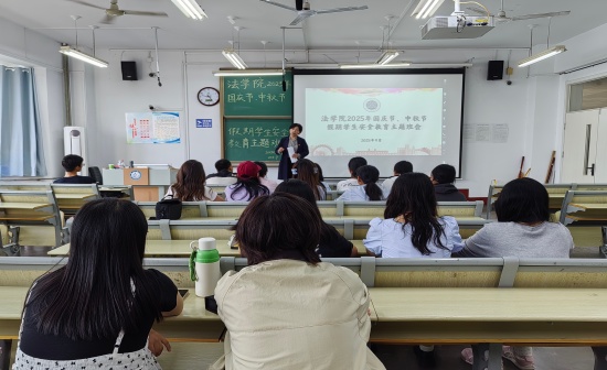 为保障学生平安欢度国庆中秋佳节,提升学生安全防范与自我保护能力,近日,法学院分专业分班级开展国庆节、中秋节假期学生安全教育主题班会。