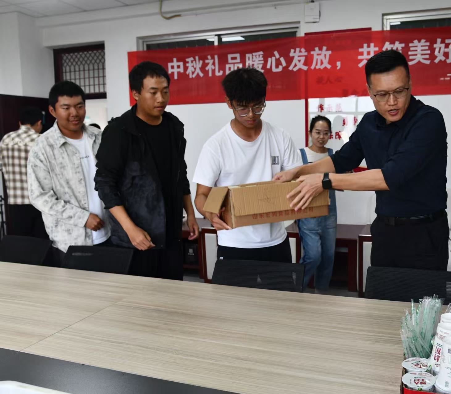 活动现场,欢声笑语,暖意融融。梁建新将充满心意的月饼和酸奶递到学生手中。精美的中秋礼品,超越了节日祝福范畴,成为承载着学院人文关怀的实物载体。发放过程中,梁建新深情寄语,为学生送上节日的问候与祝福,将勉励与期盼融入亲切的交流之中。同学们手捧这份独特的心意,纷纷表示,这份来自学院的甜蜜礼物,让他们在佳节来临之前深切感受到了“家”的温暖,极大地增强了对学院的认同感与归属感。