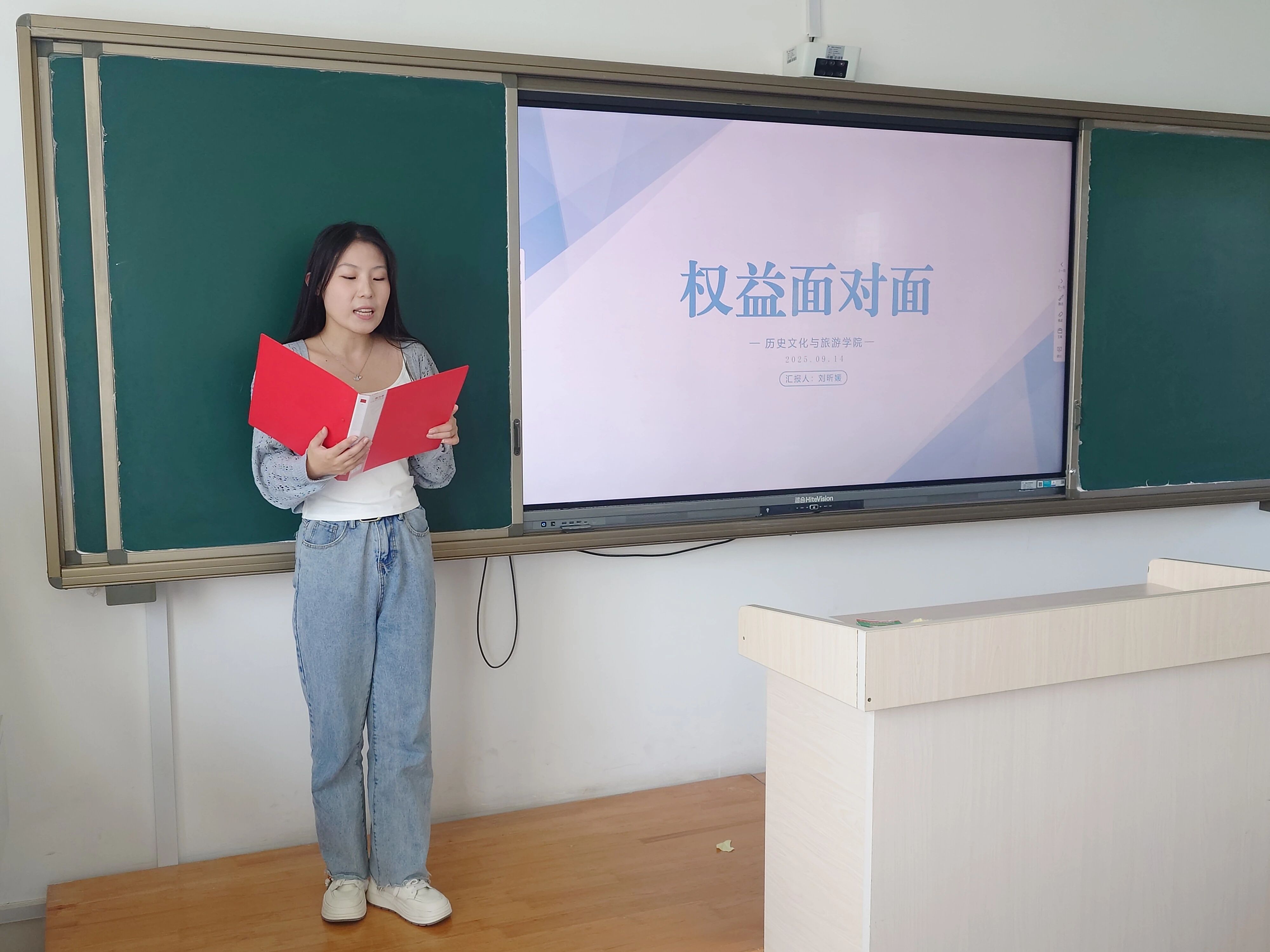 为切实回应学生权益诉求,提升学生在校生活质量,增强学生维权意识,近日,历史文化与旅游学院于6#A402教室举办“权益面对面”活动。