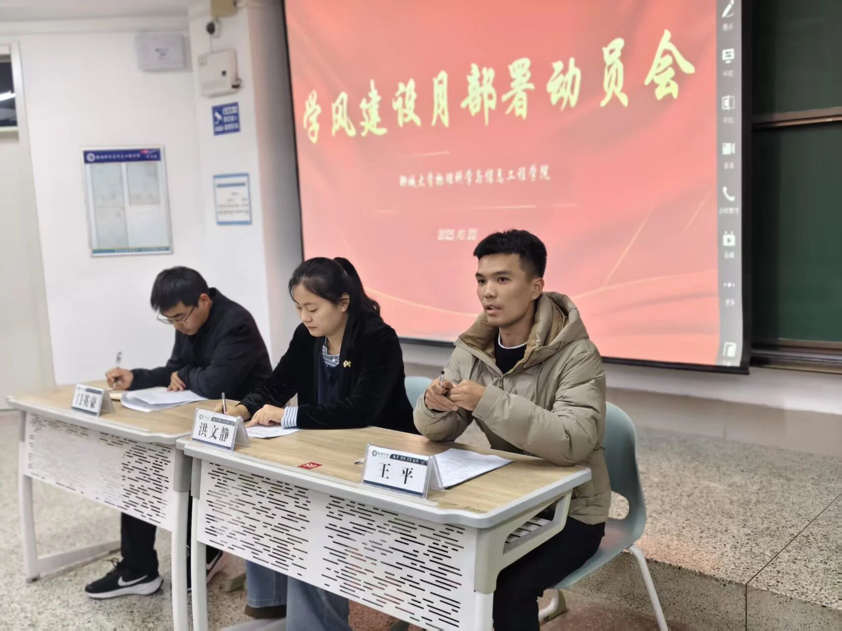为深入践行立德树人根本任务,加快学风建设提质增效步伐,携手打造勤学善思的育人氛围。10月22日,物理科学与信息工程学院于11号楼c510召开2025年学风建设月部署动员大会,学院团委书记洪文静,辅导员王平、门英豪以及各班班长和团支书共同参与本次会议。