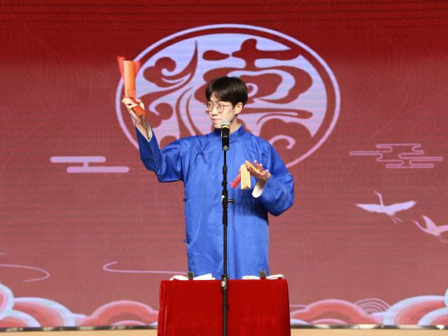 晚会以传统曲艺节目拉开序幕。王籽茗带来快板表演《三打白骨精》,娴熟的技法与清晰的节奏,生动再现经典故事场景,凭借扎实的表演功底调动现场气氛,赢得全场师生的热烈掌声。