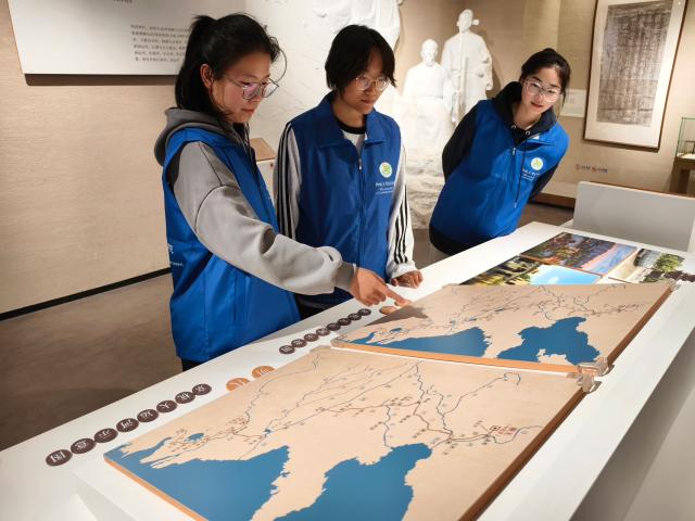 在馆内多媒体互动区域,同学们借助触摸查询屏自主检索信息,并在运河微缩模型前驻足研讨,从宏观视角系统把握了古运河工程的整体布局与构造细节。同学们参与了运河航线模拟航行体验,通过沉浸式互动直观感受古代航运的川流不息与沿岸市井的繁荣景象。多样化的展示形式与互动体验打破了时空限制,让千年运河的历史魅力鲜活地呈现在大家眼前。