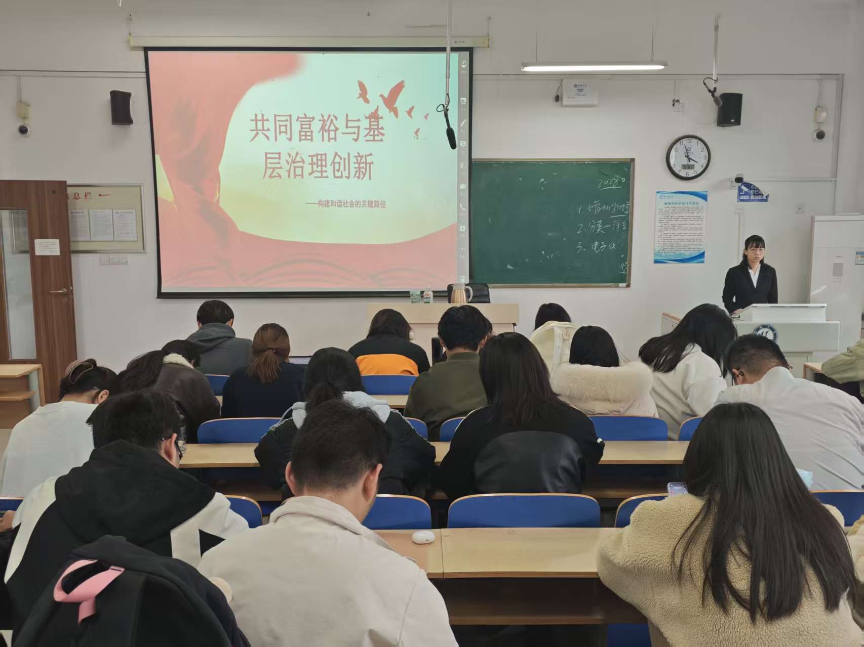 活动负责人李依帆以“时代方位”为切入点,结合国家发展大势与青年成长规律,带领学生深入领会习近平总书记对青年的深切期许,帮助其明确自身在民族复兴征程中的责任坐标。活动围绕理论学习、榜样分享与专业实践三大方向有序开展。李依帆通过逐条解读党的创新理论核心要点,搭配公共管理领域的民生政策落地案例,使学生在具象化认知中夯实信仰根基、树立正确价值导向。此外,李依帆还聚焦学科专业优势,详细介绍专业课程中如何融入社会服务理念,以及“政管实训营”和“基层调研团”等实践平台的具体运作流程。并分享往届学生通过这些平台将专业知识转化为解决群众实际问题能力的典型案例,为学生搭建起理论联系实际的桥梁。参与者徐雨馨表示,这次活动是一次深刻的思想洗礼和信念锻造,可以帮助我们从理论源头和逻辑上理解马克思主义,从而真正建立起坚实的信仰根基,摆脱对理论的“一知半解”或“枯燥”的印象。