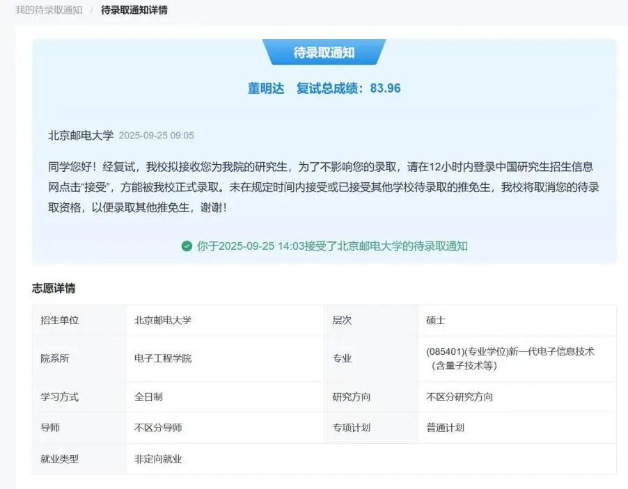 董明达,中共预备党员,2022级07班通信工程专业学生,目前已经拟录取到北京邮电大学新一代电子信息技术专业。