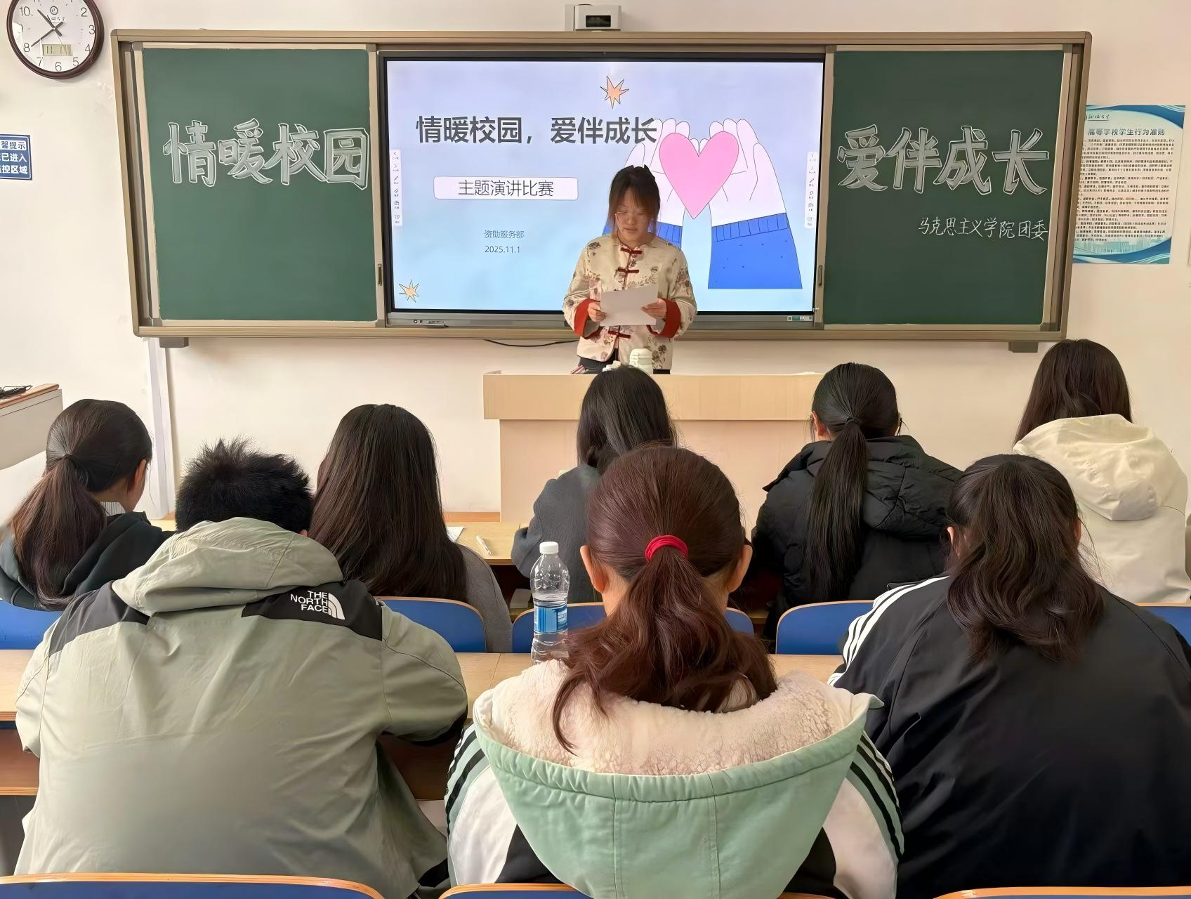 为进一步传递校园温情、凝聚爱心力量,引导学生在互助中学会感恩、在陪伴中共同成长,11月4日,马克思主义学院于东校区6#A205举办“情暖校园,爱伴成长”主题演讲比赛。