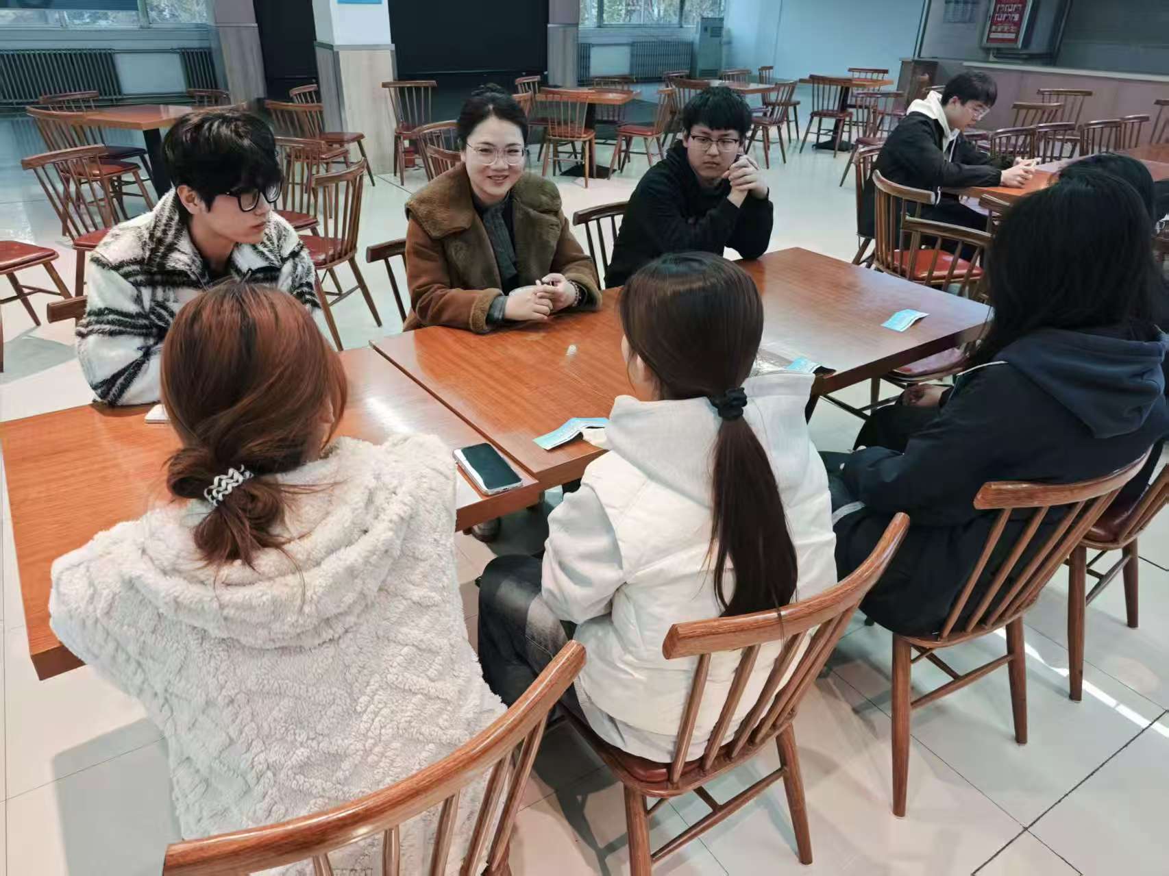 餐厅里的轻松氛围打破了沟通隔阂,吕伟伟与同学们围坐畅谈,耐心倾听大家在课程学习、时间管理、学科基础等方面的真实困惑。针对学生诉求,她精准给出针对性建议,着重强调要主动关注自身学习状态,及时调节不良情绪,建立科学的学居节奏,筑牢学业提升与心理健康“双防线”,让帮扶引导更有温度、更具实效。
