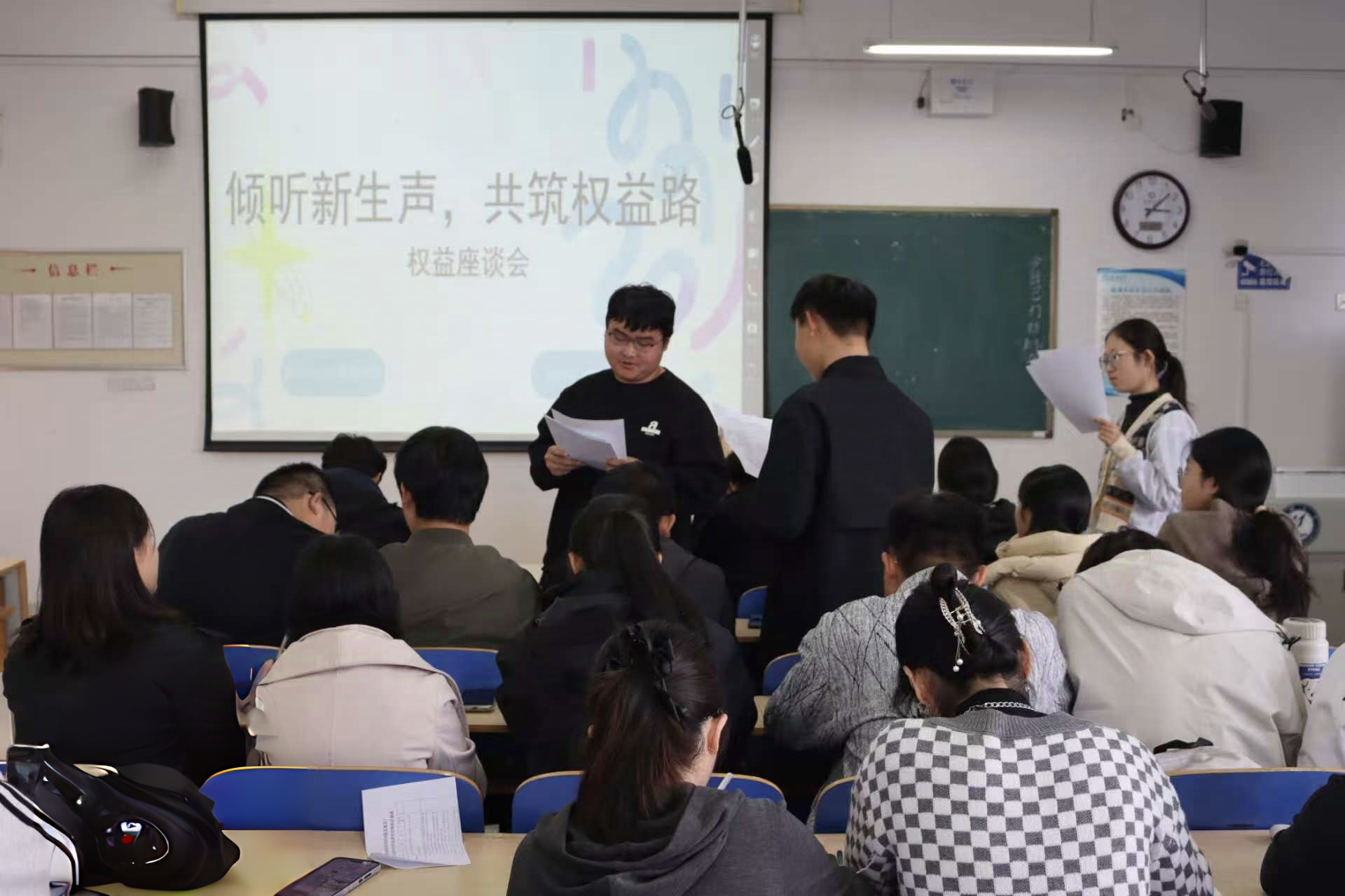 为切实解决新生在校园学习生活中遇到的各种问题,保障新生在校园内的各项正当权益,11月16日,政治与公共管理学院于东校区6#c301举办“倾听新生声,共筑权益路”权益座谈会。本次活动由2025级各班班长、权益委员、学生代表及各部门负责人共同参与。