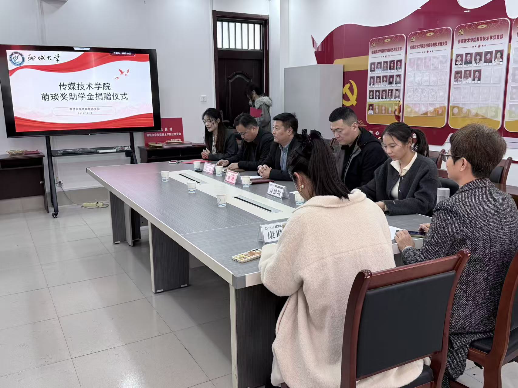 11月20日,传媒技术学院于11#B503举办萌琰助学金捐赠仪式。社会爱心人士高德琦先生、王爽女士,传媒技术学院院长郭峰,副院长赵勇,及部分教师、学生代表参加此次会议,专职辅导员杜相晴主持会议。