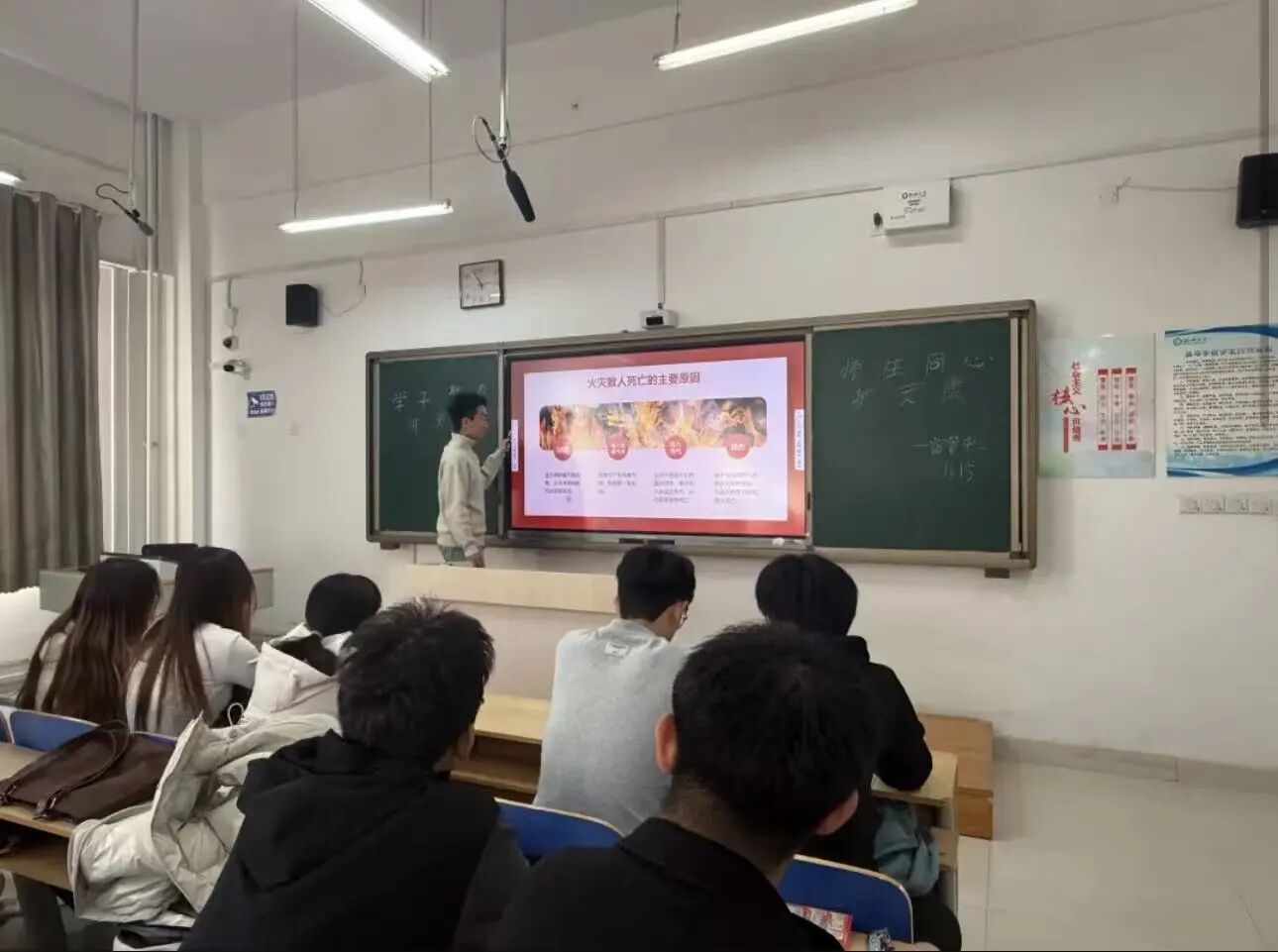 参赛选手依次上台,结合精心制作的消防安全PPT,从火灾成因、预防手段、应急处理及疏散自救等多个方面展开讲解,并通过真实案例、数据统计和生动图片,直观全面地展现消防安全在日常学习生活中的关键作用。崔婧文以校园典型火情为例,剖析事故原因与严重后果,警示同学们务必重视宿舍的用电安全,并通过动态图示还原火场疏散路径选择,呼吁同学们争当消防宣传的志愿者。张东齐系统阐释火灾对生命与财产的双重威胁,强调同学们需扎实掌握基本防火灭火常识,同时借助视频演示,向同学们普及常见消防器材的正确使用方法。