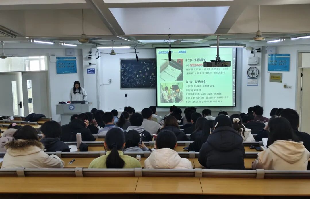 活动伊始,苏晓菲以自身社团实践与科创竞赛经历为切入点,系统分享了个人成长历程。她从社团实践中的基础能力积累,到参与“挑战杯”“节能减排”等国家级、省级科创赛事的实战历练,全面阐述了科创道路上的探索与收获。她结合自身感悟,鼓励大家主动投身实践,在科创探索中丰富学识、增长才干。
