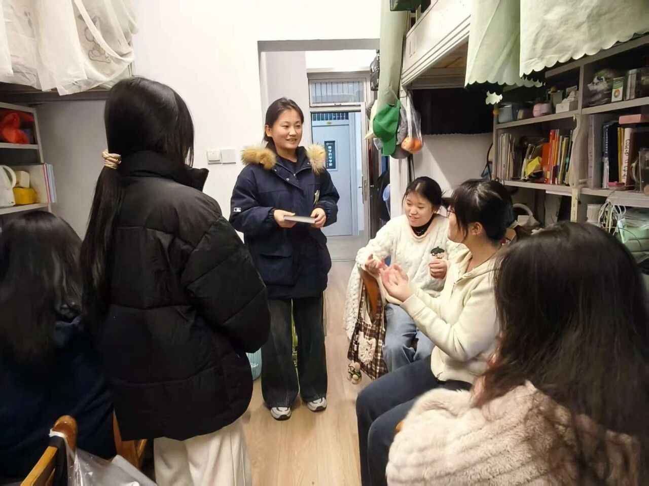 为避免打扰考研同学的复习节奏,同学们特意选择在复习间隙前往宿舍,用热切的问候打破距离感,了解学姐们当下的复习状态,认真倾听她们当前面临的难题,心态调节困扰等,同学们提前准备了解压小礼品,希望学长学姐们在紧凑的复习状态下能适当的放松自己。为营造轻松氛围,同学们还设计了团体辅导小游戏,帮助学长学姐们放松身心,感受来自集体的关怀和温暖。最后,同学们将提前写好的便签祝福语送到学长学姐手中,“愿你笔锋所至,皆是坦途”“冲刺的每一步都算数,加油!”等一句句温暖的话语成为了具象化的情感载体,将朋辈的支持与学院的关怀,稳稳地传递至每个人心中。