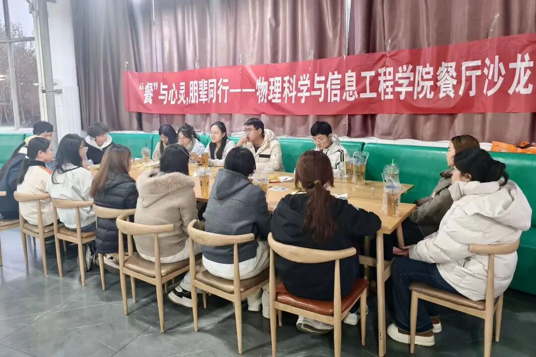为进一步畅通师生沟通渠道,提升班级心理委员及心理工作中心成员的业务能力,精准掌握学生心理健康动态,11月24日,物理科学与信息工程学院组织开展“餐”与心灵,朋辈同行——餐厅沙龙活动。本次活动邀请了学院辅导员门英豪、李姝霆及部分学生代表共同参与。