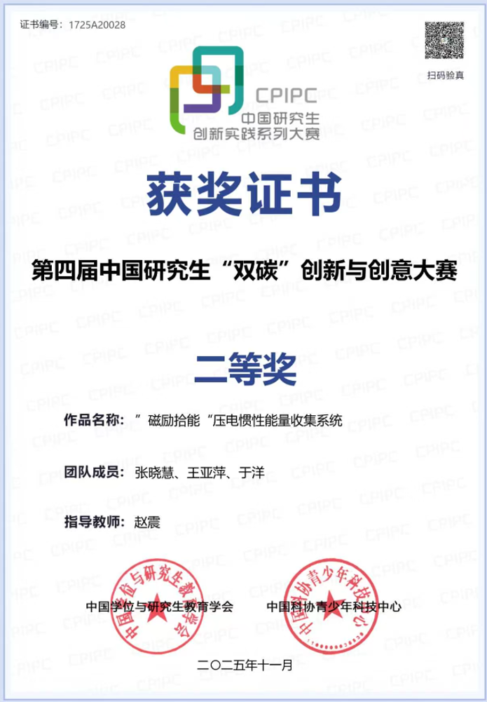 近日,“沈化百特杯”第四届中国研究生“双碳”创新与创意大赛决赛公布获奖名单。机械与汽车工程学院24级研究生张晓慧、王亚萍、于洋参赛,赵震老师指导的项目《“磁励拾能”压电惯性能量收集系统》荣获国赛二等奖。