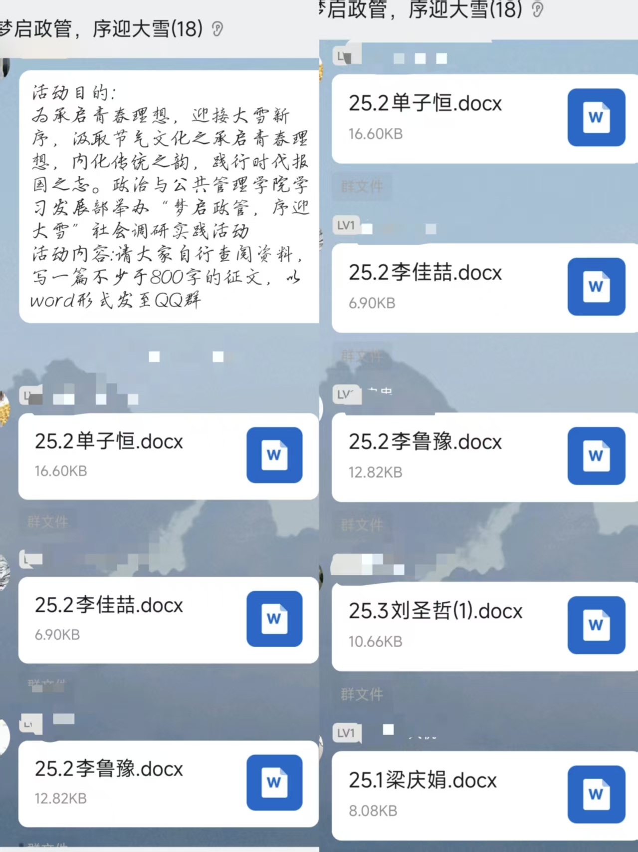 活动负责人武新宁以“承传统之韵,启时代之行”为出发点,阐明本次线上征文的意义与目标。武新宁指出,节气文化承载着中华民族的历史智慧与精神追求。她希望同学们深入社会、扎根生活,在实践中感悟传统文化当代价值,将坚定文化自信转化为自觉行动。她强调,此次征文活动既是文学创作的契机,更是深化思考、提升自我的平台,鼓励同学们积极参与征文活动,提交作品。参与者围绕大雪节气相关民俗、饮食文化等内容,通过观察记录等多种形式开展调研,踊跃参与,积极投稿,以文章形式展现对大雪节气民俗的关注、思考与讨论。他们结合专业知识,提出推动节气文化创新传播的建议,真正地把优秀传统文化的养分转化为青年担当的动力。参与者李俊瑜表示,这次调研不仅让她对大雪节气及其文化内涵有更鲜活、更深入地认识,还让她体会到优秀传统文化在当代社会中的生命力。