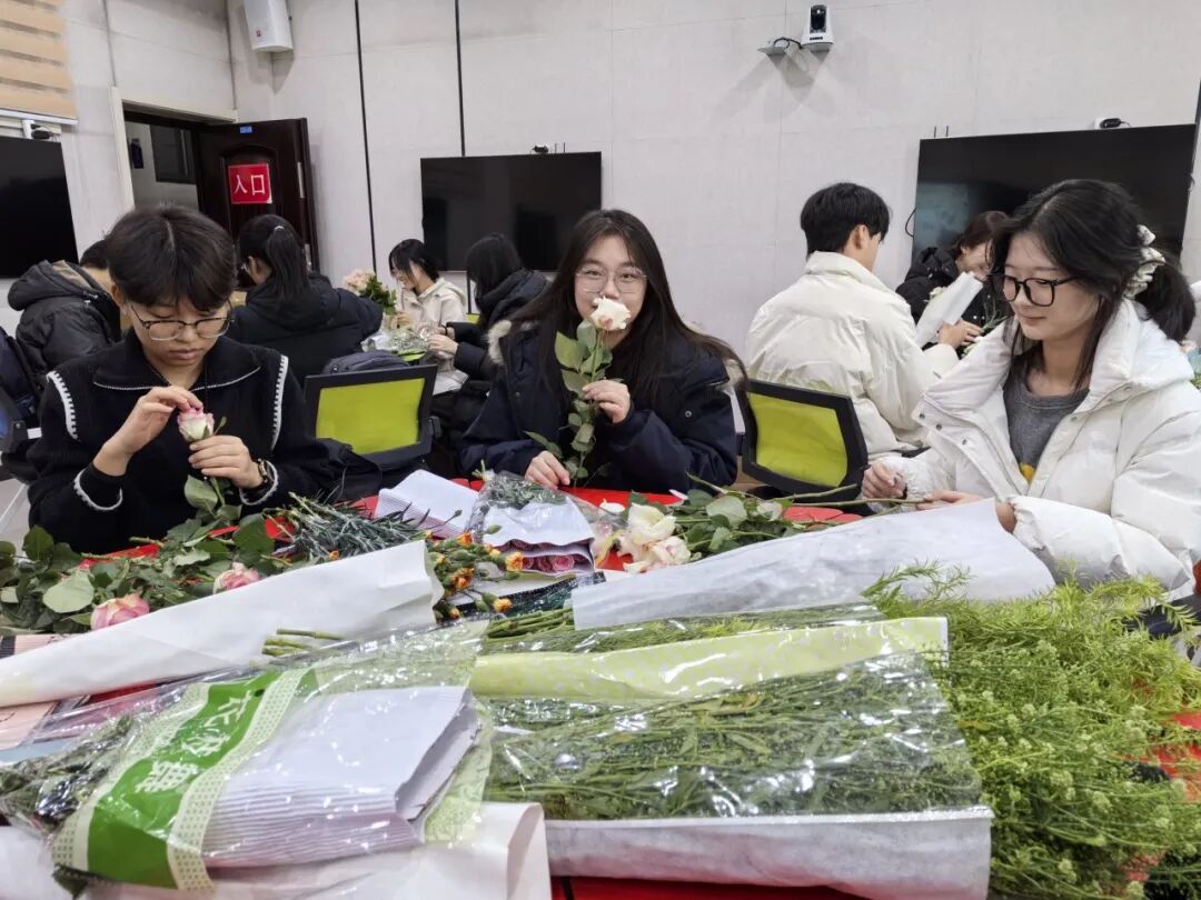 活动伊始,孙明娟结合自身积累的实践经验,从花材选择、色彩搭配、基础造型设计等方面进行了细致分享,还现场演示了修剪花枝、固定花材等简易技巧,同时向同学们介绍了玫瑰、康乃馨、洋桔梗等常见花材的寓意,为同学们的创作提供了思路。随后,同学们自由挑选花材,结合花卉的形态特征构思作品框架。创作过程中,同学们围坐一起共同交流灵感、相互借鉴,现场花香萦绕,青春活力与创作热情交织,氛围热烈而融洽。最终,一束束造型新颖、寓意深远的插花作品相继完成,既展现了花卉的自然之美,又融入了学子们对青春与初心的理解。