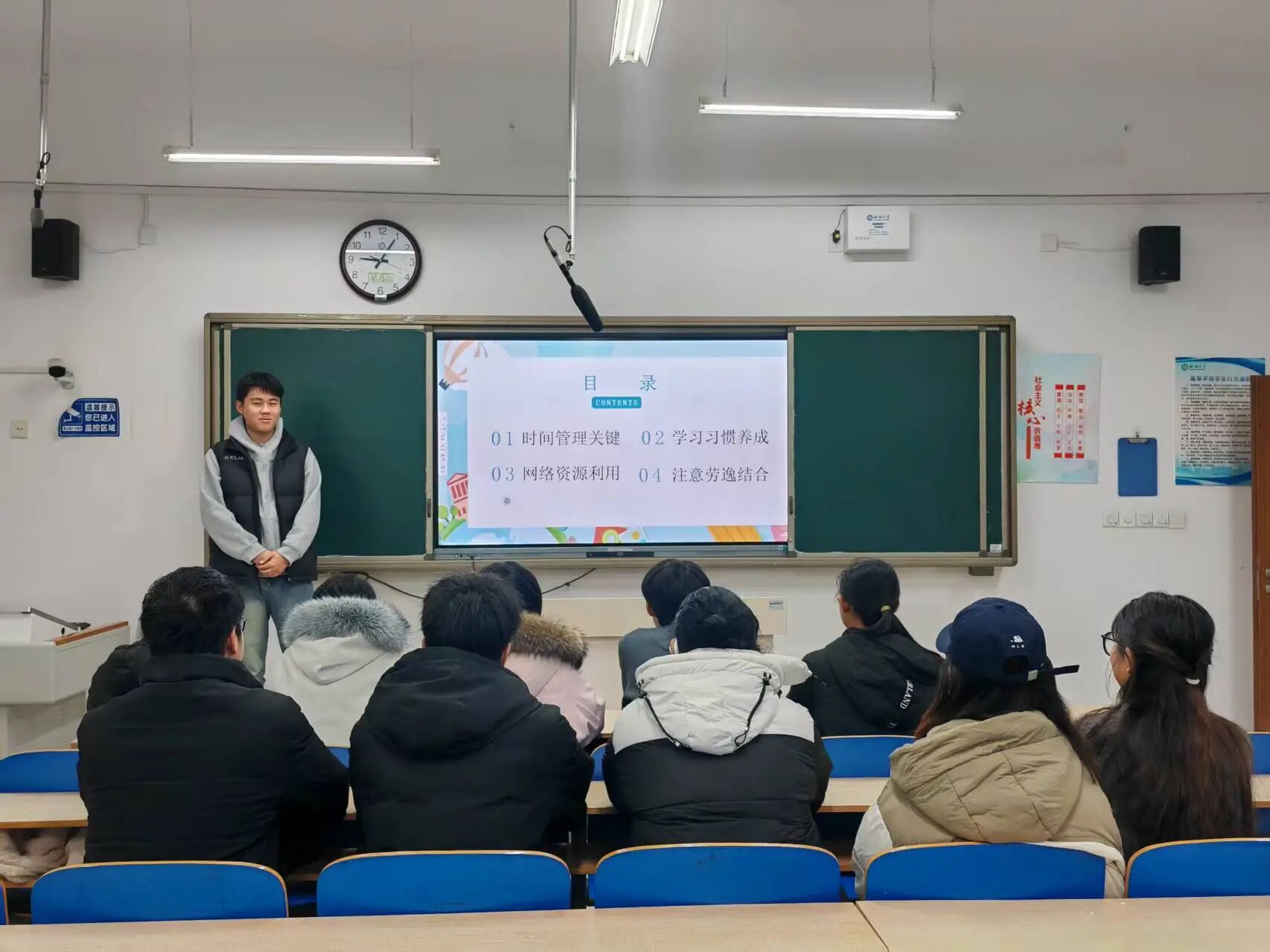 交流会上,两位主讲人结合自身成长经历,分享实用学习心得。胡书宾聚焦学习与压力的平衡,从课堂专注技巧、课后复盘方法、碎片化时间利用三个方面,鼓励学生以“积跬步”的坚持积累学业底气。刘爽围绕优势挖掘与稳步提升展开分享,结合专业学习特点,建议同学们借助线上资源补短板、依托学科竞赛提升能力,以期更好地提升综合素质。