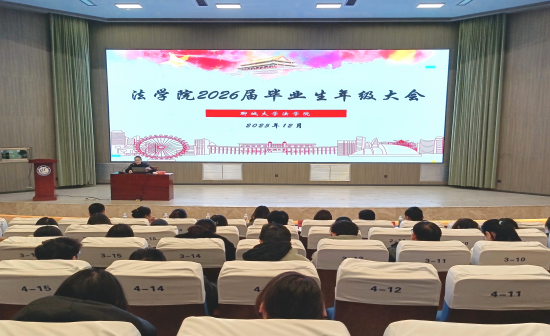 12月23日,法学院于东校区实验实训楼召开2026届毕业生年级大会,法学院党委副书记、副院长刘洁,实践教研室教师李景玲、王文洁,教务秘书刘江英,辅导员李宁、马丽亚,兼职辅导员陈星宇出席本次大会,大会由辅导员孟冠军主持,2022级全体学生参加。
