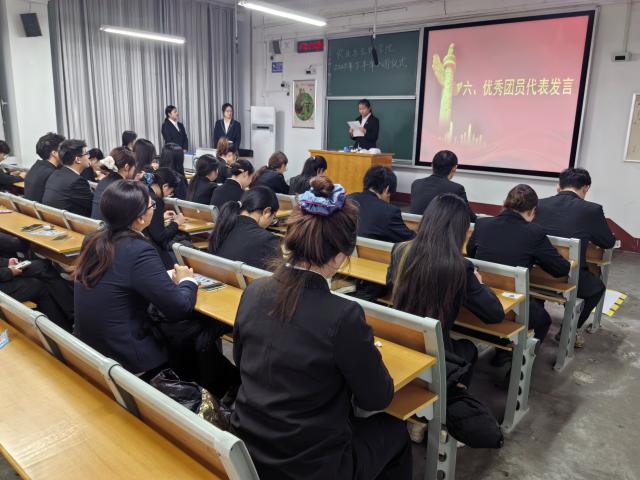“我志愿加入中国共产主义青年团……”面向鲜艳的团旗,全体新团员举起右拳,在领誓人刘佳睿的带领下,以铿锵有力的誓言,许下为共产主义事业奋斗终身的庄严承诺。铮铮誓言在会场回响,彰显着青年学子的坚定与赤诚。在团员代表发言环节,新团员代表张仕桢表示,将以入团为新的起点,严格遵守团的章程,认真履行团员义务;优秀团员代表史芳伊结合自身经历,鼓励新团员勤奋学习、积极作为。最后,全场齐声高唱共青团团歌,入团仪式在激昂的歌声中圆满结束。