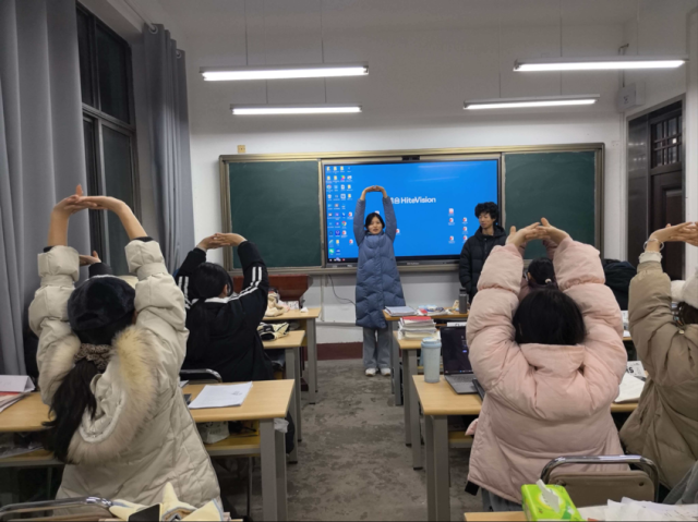 活动前期,文体活动部提前筹备,精选适配学生久坐学习的简易热身操,明确动作要领与教学流程。活动中,各班级负责人受文体活动部委托,带领学生逐节学习热身操,从头部扭转、肩部环绕,到腰部拉伸、膝关节活动,再到全身舒展,每一个动作都细致示范、耐心讲解,着重强调热身对预防运动损伤、缓解久坐疲劳的重要性。学生们跟随指导认真练习,动作整齐划一,班级内互动氛围浓厚,在循序渐进的练习中掌握标准热身动作,有效舒展身体、放松身心。文体活动部还提醒学生,日常学习间隙可随时练习,养成课前课后热身的好习惯,以更好的状态投入学习生活。