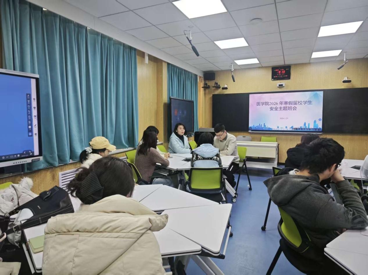 为切实加强寒假留校学生安全管理,保障学生人身及财产安全,引导学生度过一个平安、健康、充实的假期,1 月 23日,医学院组织召开 2026 年寒假留校学生安全主题班会。辅导员白东芳、冯昌顺以及全体寒假留校学生参加。