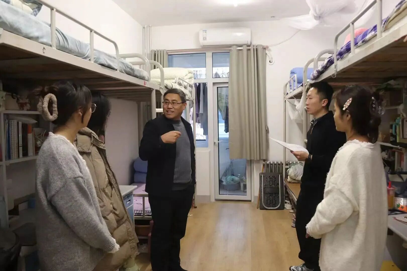 在走访过程中,老师们以宿舍安全排查为基础,重点查看宿舍内用电安全情况,进一步强化宿舍安全意识。老师们与学生亲切交谈,聚焦刚结束研究生考试的学生,细致询问其考试发挥、身心状态及作息调整情况,耐心倾听学生在备考过程中遇到的困难。