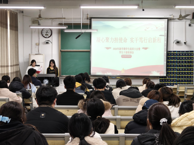 为进一步加强学院学生组织建设,凝聚团学骨干力量,明确新学期工作目标,提升学生干部综合素养与履职能力,3月8日下午,外国语学院在A112教室顺利召开2026年新学期学生组织大会暨学生干部培训大会。学院团委书记、学生组织全体主要成员及各班团学生干部参加本次会议。