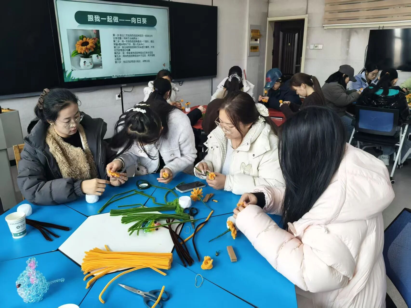 活动现场,聊城市特殊教育学校视障学生马家怡带来了一场别具意义的创作分享——她以扭扭棒为媒介,将向日葵的“向阳”意象融入手工创作,带领我院师生沉浸式感受指尖美学。视力的局限并未阻挡她对美的追求,她凭借细腻的触感与专注的神情,一步步示范、耐心指导,用灵巧的指尖传递出不向困境低头的坚韧,也让每位参与者在动手实践中,真切体会到“心向阳光”的美好与力量。我院师生互帮互助、默契协作,从扭扭棒的弯折到花瓣的塑形,在动手实践中交流互动、传递温情。
