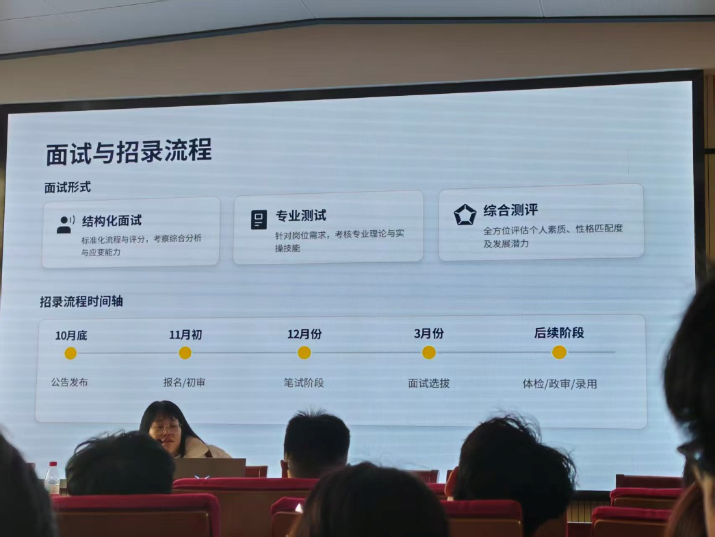 本次宣讲会由就业创业服务中心牵头开展。来自军队文职的专业老师进行了专题讲解,围绕军队文职的岗位性质、招录流程、薪资待遇、职业发展规划及日常管理要求等核心内容展开细致介绍,结合实际案例生动解读了文职人员在国防和军队建设中的职责与使命,让学生对军队文职这一就业方向有了清晰的认知。