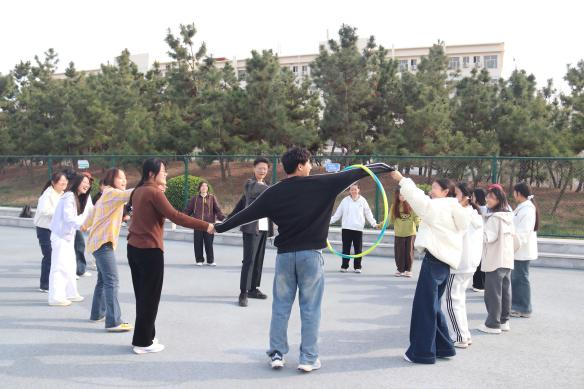 活动现场气氛热烈,张家铜以成员自我介绍暖心开场,“呼啦圈传递”“爱的抱抱”“你画我猜”三个特色活动让同学们在轻松互动中逐渐打破隔阂,拉近彼此距离。“呼啦圈传递”活动,同学们在不借助双手的条件下,将呼啦圈依次传递给下一位成员。大家默契配合,现场加油声此起彼伏,团队协作成为通关的关键。“爱的抱抱”活动,张家铜根据每位同学的穿搭特点进行分组,黑色外套者代表“一元”,其他颜色外套者代表“五角”。随着金额随机报出,大家迅速反应、彼此组队拥抱,初识的陌生感在一次次拥抱中悄然化解。