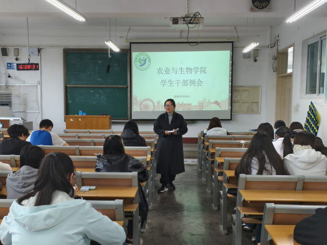 为扎实推进学生工作,保障学生身心健康,营造良好学风,3月29日,农业与生物学院于东校区二号教学楼501召开学生干部例会,学院辅导员李岩、张玉莹出席并主持本次会议。