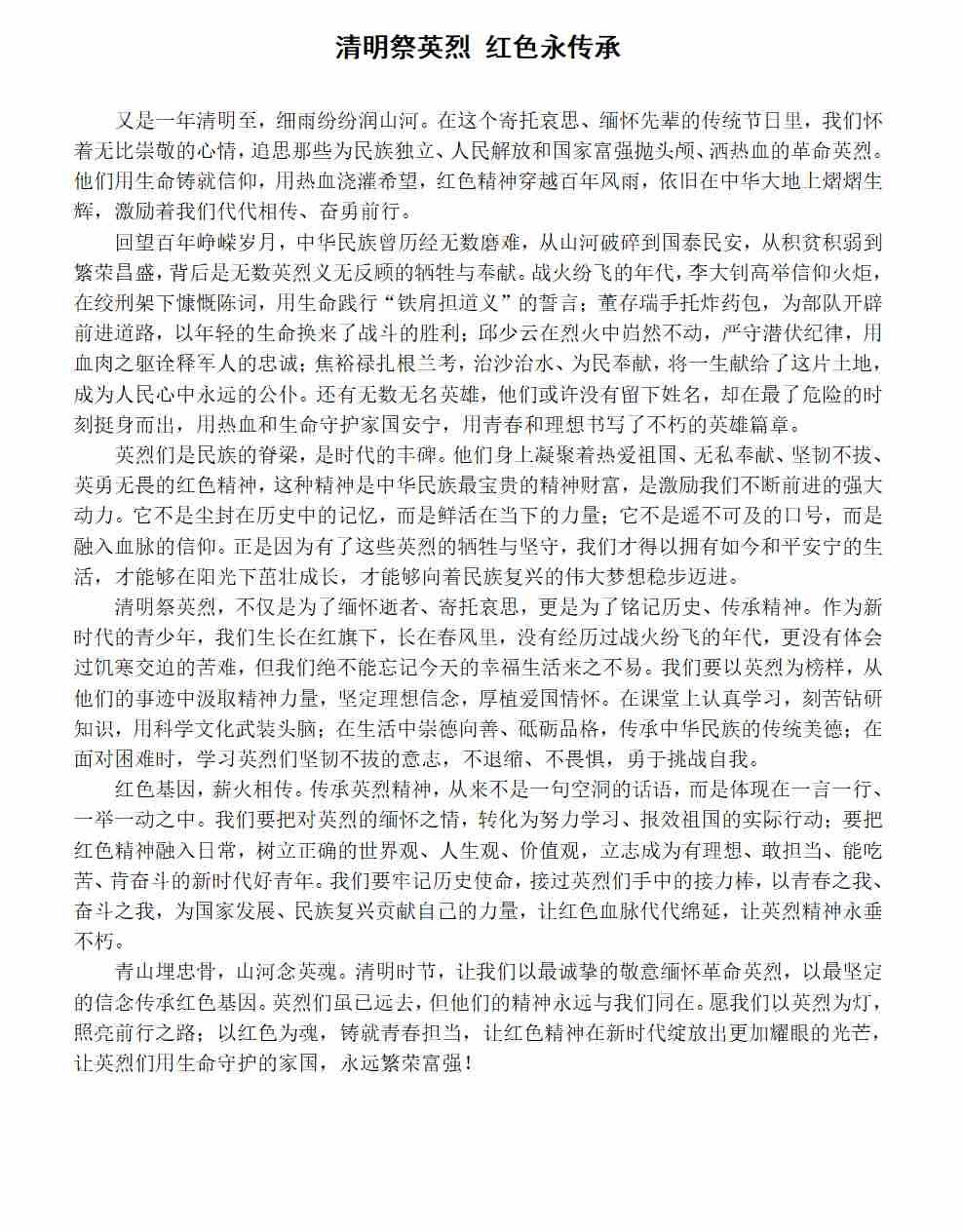 清明寄哀思先烈,笔墨传薪⽕赓魂。本次活动以征文为核心载体,旨在引导全院学生深入学习革命先烈的英勇事迹,从红色历史中汲取奋进力量。活动筹备阶段,学院通过线上线下多渠道广泛宣传,鼓励同学们主动查阅史料、深挖红色故事,用文字定格英烈精神、用笔墨抒发崇敬之情。参赛学生围绕主题,结合自身感悟,以真挚的笔触书写对革命先烈的缅怀与敬意:有的同学聚焦本地红色英雄,还原他们为家国挺身而出的热血瞬间;有的同学结合专业特色,用多元文体解读红色精神的时代内涵;还有的同学在创作中反复打磨文稿、锤炼语言,力求以最饱满的情感,传递对革命先烈的追思与传承红色血脉的决心。