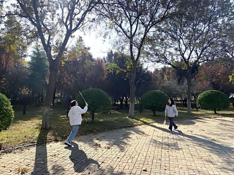 羽毛球环节在日晷广场开阔区域进行,重点设置了发球体验区和定点击球区。发球体验区供同学们自由练习发球动作,互相交流发力技巧;定点击球区则放置了简易目标圈,同学们可尝试将球打入圈内,以趣味方式提升控球感。活动现场氛围融洽。