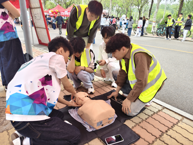 活动现场,党员志愿者们分工协作、各司其职,为往来师生提供免费血压测量服务,细致记录检测数据,提供科学的健康指导,耐心解答日常保健、运动防护等各类健康咨询,切实为师生答疑解惑。现场互动氛围热烈,前来咨询和测量血压的师生络绎不绝。与此同时,急救科普教学同步开展,学生党员借助心肺复苏模拟假人,现场完整演示心肺复苏规范操作流程,分步讲解胸外按压、人工呼吸的核心操作要点,还细致讲解海姆立克急救法适用场景与操作规范,主动引导在场同学动手实操、逐一纠正动作偏差,让大家精准掌握基础急救技能,提升应急处置能力。生动实用的讲解与沉浸式实操体验,赢得了在场师生的一致认可与好评。全体志愿者以饱满的热情坚守岗位,用专业、暖心的服务,为校运会平稳有序进行提供了有力的健康保障。