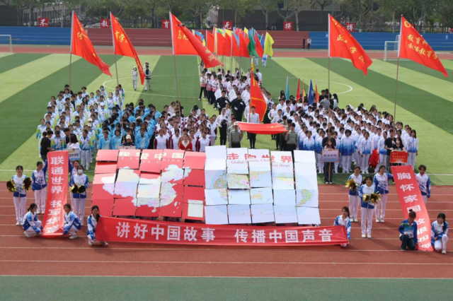 激昂奋进的《运动员进行曲》奏响,外国语学院仪仗队迈着矫健有力的步伐入场。队员身着统一服装,气宇轩昂,队列行进间,每一次摆臂都精准有力,每一个转身都整齐划一,尽显外院学子的严明纪律与蓬勃朝气。行进至场地中央,队员将手中零散的拼图板块迅速拼接,一幅完整的中国地图与世界地图徐徐铺展,完美契合外国语学院语联中外、放眼世界的办学特色,将家国情怀与国际视野展现得淋漓尽致。外国语学院创意十足的表演赢得了现场观众的阵阵掌声与欢呼,成为开幕式上一道独树一帜的亮眼风景线。