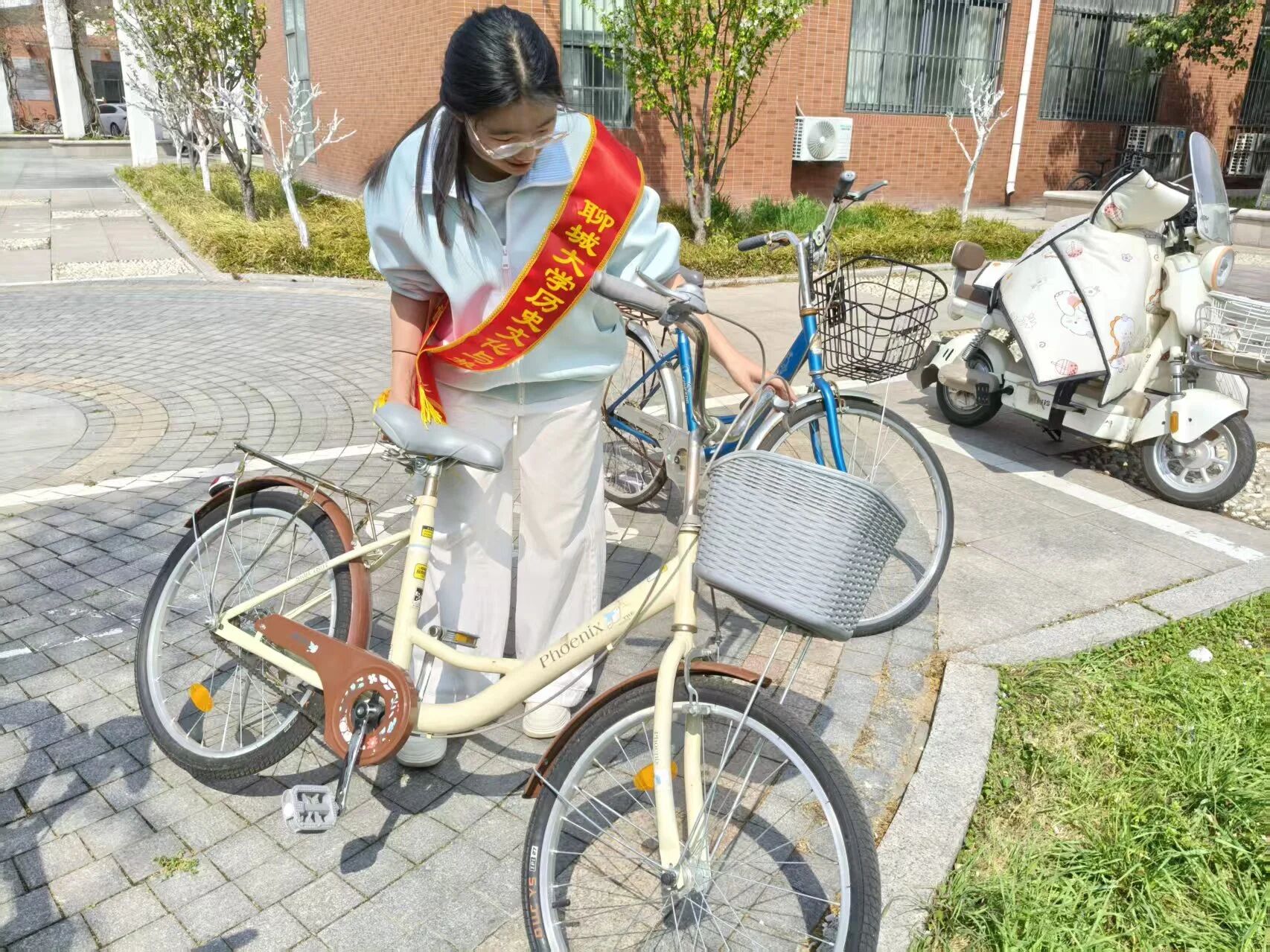 服务队队员分组开展校园志愿服务。单车停放区域内,一组服务队队员扶起倒地单车并摆放规整,同时引导过往同学规范停车,草坪上,另一组服务队队员手持垃圾袋与夹子,细致清理纸屑、塑料袋等杂物,不留一处卫生死角。擦拭桌椅的服务队队员自带抹布与水盆,认真清洁教室内外桌椅,为师生营造整洁舒适的学习与休憩环境。